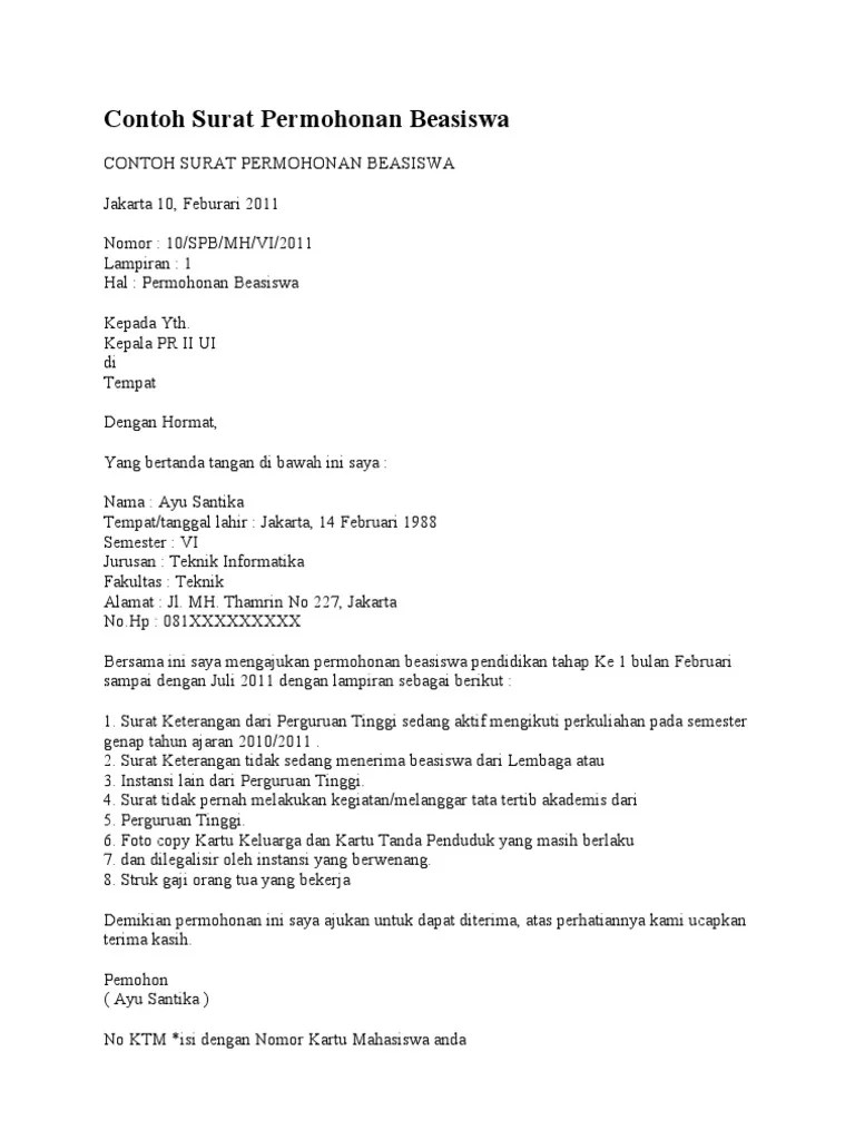 Surat pengajuan atau permohonan beasiswa dari orang tua / wali. Isi dari surat pengajuan beasiswa ini adalah menjelaskan jika dirinya memohon diberikan beasiswa baik beasiswa prestasi ataupu beasiswa kurang . Kami juga mengetahui maksud surat keterangan ini sebagai salah satu persyaratan siswa tersebut di atas untuk mengajukan. Rt 69 rw 1 measan, bulu, lendah, kulon progo. (bagi yang bukan pegawai negeri / abri / pensiunan).